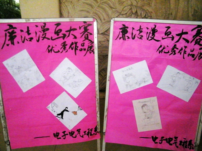 为进一步深入落实江苏省教育厅《关于组织开展全省第五届“校园廉洁文化活动周”的通知》精神,切实把廉洁文化校园活动的目的、意义宣传到位,公司电子系举办了廉洁漫画大赛,并把漫画大赛优秀作品以展示的形式进行廉政文化的宣传。