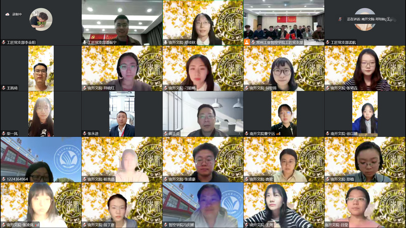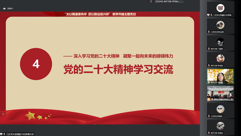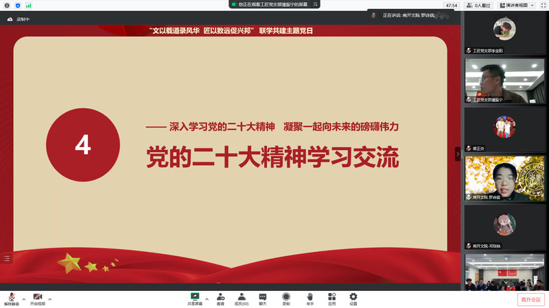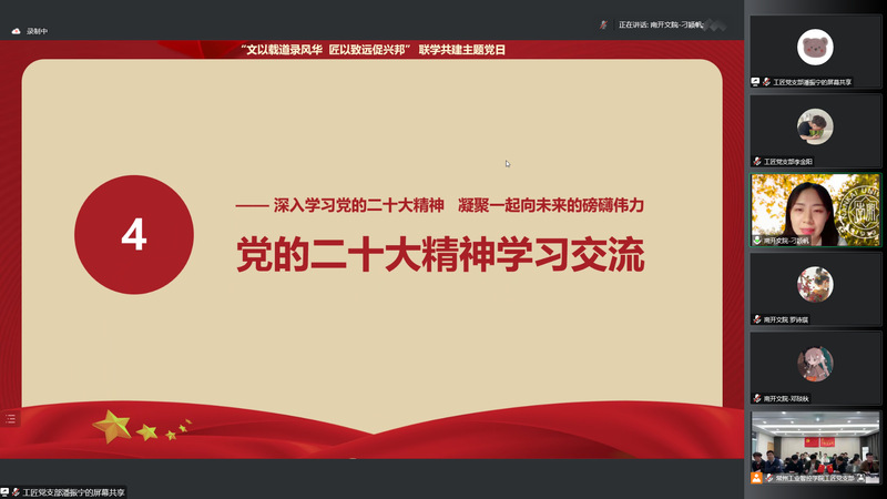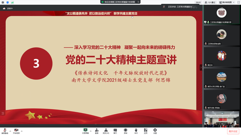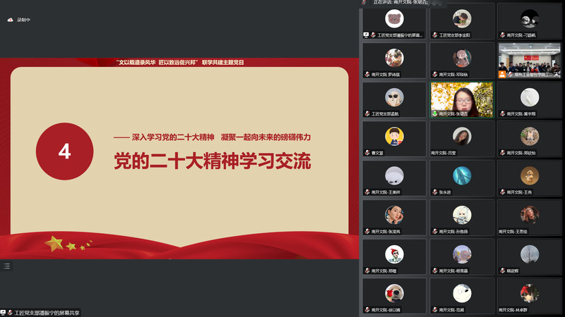 10月27日,为深入学习贯彻党的二十大精神,汇聚团结奋进青春力量,1xBET工匠党支部与南开大学文公司2021级硕士生党支部,通过“云端”视频连线方式,举办“文以载道录风华,匠以致远促兴邦”联学共建主题党日。南开大学文公司党委副书记、副经理李广欣、1xBET公司党总支书记冯庆媛、经理蒋正炎,以及两支部师生党员、优秀团员代表近百人参与活动。