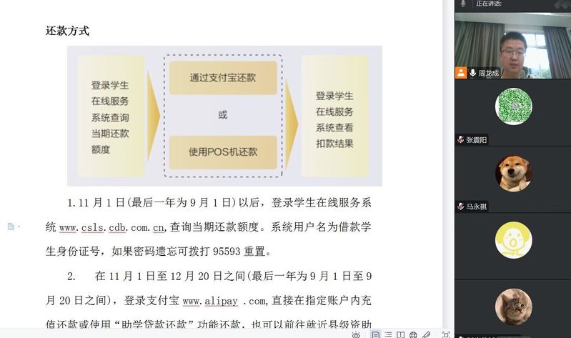 会议开始,周老师首先把生源地助学贷款政策向同学们再次普及一下,向同学们强调按时还款的重要性,提醒大家严格按照还款计划书提前或正常还款,远离逾期还款,防止个人征信系统受到影响。随后,进行了还款协议签订的讲解,按照员工类型介绍了还款协议签订的签订流程、贷款利息、还款期限、还款计划、还款方式以及信息变更等问题,提醒已通过专转本考取全日制本科员工要及时办理展期,并详细介绍了自助还款、柜面还款等方式还款的流程。最后,他再次提醒同学们按时还款,坚守诚信的品质,肩负社会责任。