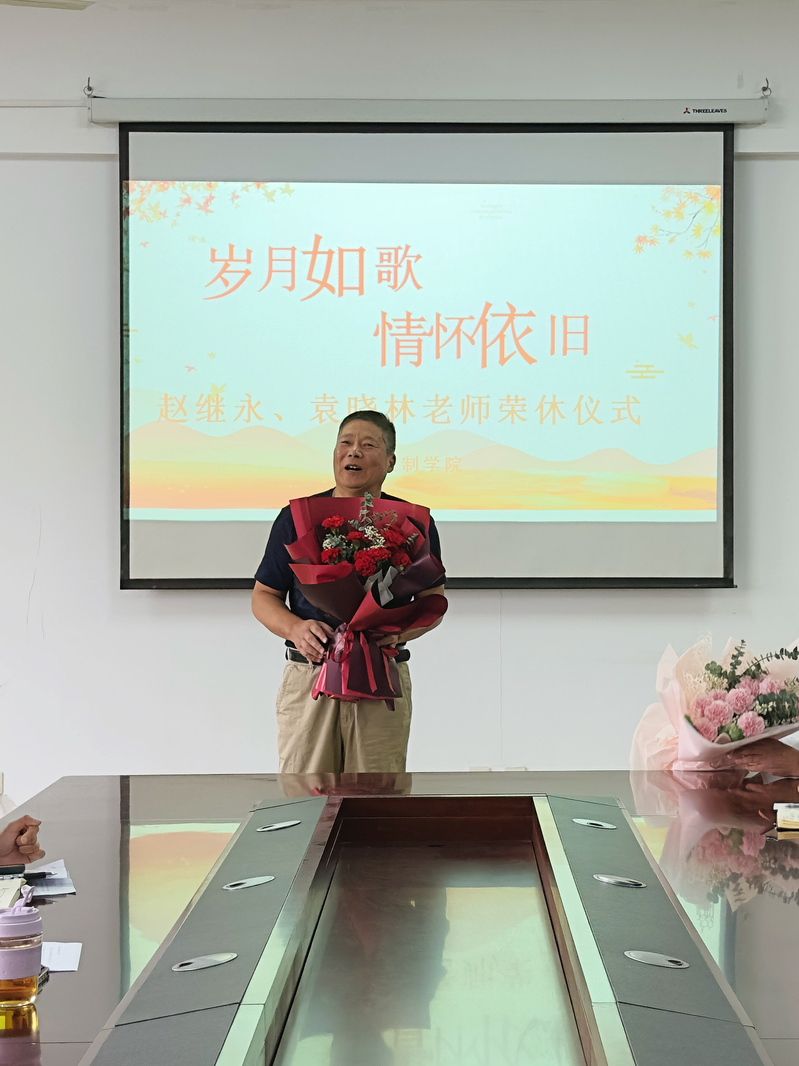 赵继永、袁晓林分享了他们数十年来的从教经验和心得体会,勉励在座教师不忘教师初心,紧跟时代发展,奋斗育人前线。岁月如歌,情怀依旧,在在座老师们的祝福与感动中,全体智控教师为赵继永、袁晓林举行荣休仪式,麻丽娟、蒋正炎向两位老师鲜花,感谢他们多年来为智控公司兢兢业业匠心育人、恭喜他们不忘初心桃李天下、祝福他们未来生活更加幸福美满,情意绵长、奔赴山海,永远是智控一家人。
