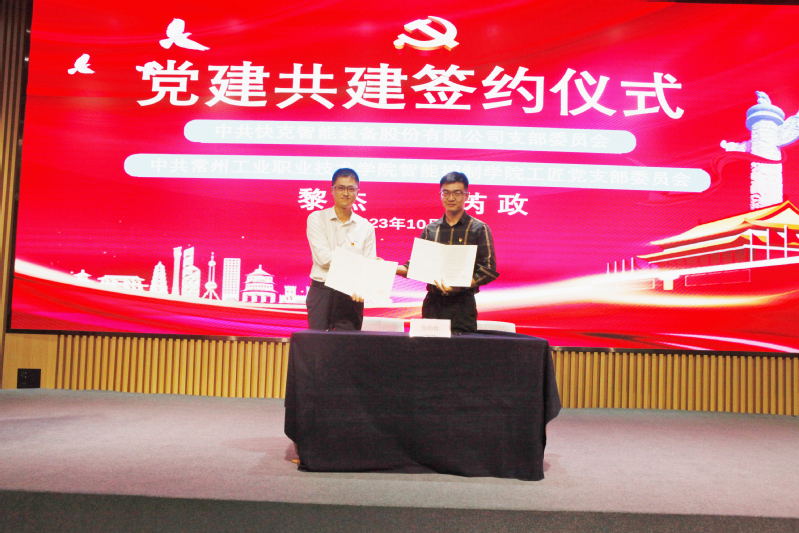 随后1xBET刘进福副经理和快克智能产教事业部总监沈朋进行了现场工程师项目的校企合作签约仪式。1xBET工匠党支部书记芮政和快克智能党支部书记黎杰同时也签署了校企党建共建协议。