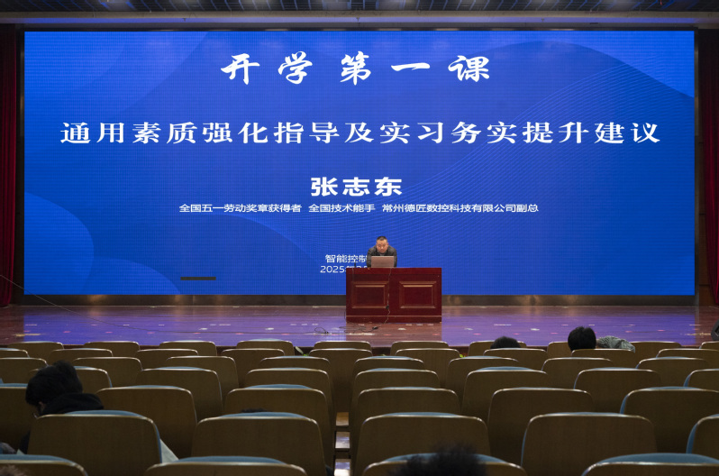2025年2月26日,公司开展“大先生带小工匠”系列活动,邀请全国五一劳动奖章获得者、全国技术能手、常州德匠数控科技有限公司副总、公司优秀员工张志东,为2024级全体同学开展“通用素质强化指导与实习务实提升建议”主题讲座。
