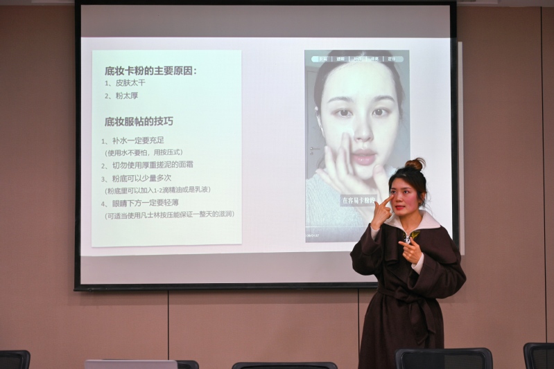 活动特邀艺术创意公司曾索烨老师主讲。通过理论讲解+现场示范+一对一指导的沉浸式教学,曾老师从职场妆容定位、底妆打造技巧到眉眼修饰要诀进行系统讲解。现场教师们专注记录要点,在互动体验中掌握了快速打造清新职业妆的秘诀。更有教职工主动担任模特,在欢声笑语中掌握快速打造职场精致形象的秘诀。