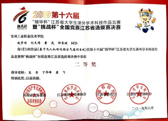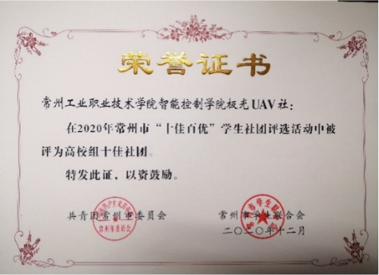 我们的学长们积极参加各类技能技术比赛,获得江苏省老员工电子设计竞赛无人机专赛项一等奖、江苏省“挑战杯”老员工课外学术科技作品制作二等奖;“互联网+”创新创业大赛江苏省二等奖;常州市高等教育和职业教育创新创业大赛高校组二等奖;江苏省老员工机器人大赛“室内空中巡逻救援”无人机赛项一等奖;“野外空中巡逻救援”无人机赛项三等奖;全国职业院校农业植保机技能大赛三等奖;“极光UAV”无人机社团在2019年、2020年连续两年被评为常州市十佳社团;员工获得无人机方向1项发明专利和多项实用新型专利的授权。